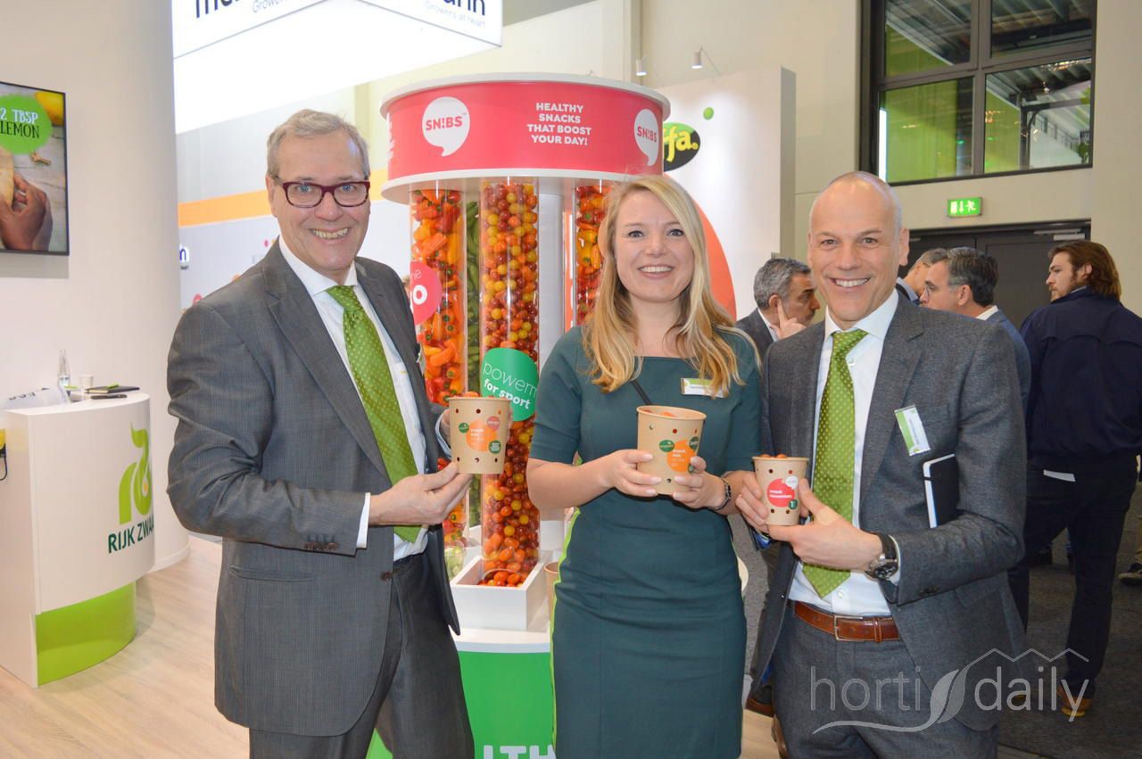 Steven van Paassen, Vera van Hoondert en Jan Doldersum. Rijk Zwaan presenteert op Fruit Logistica Sn!b. Sn!b is het marketingconcept voor hun snackgroenten