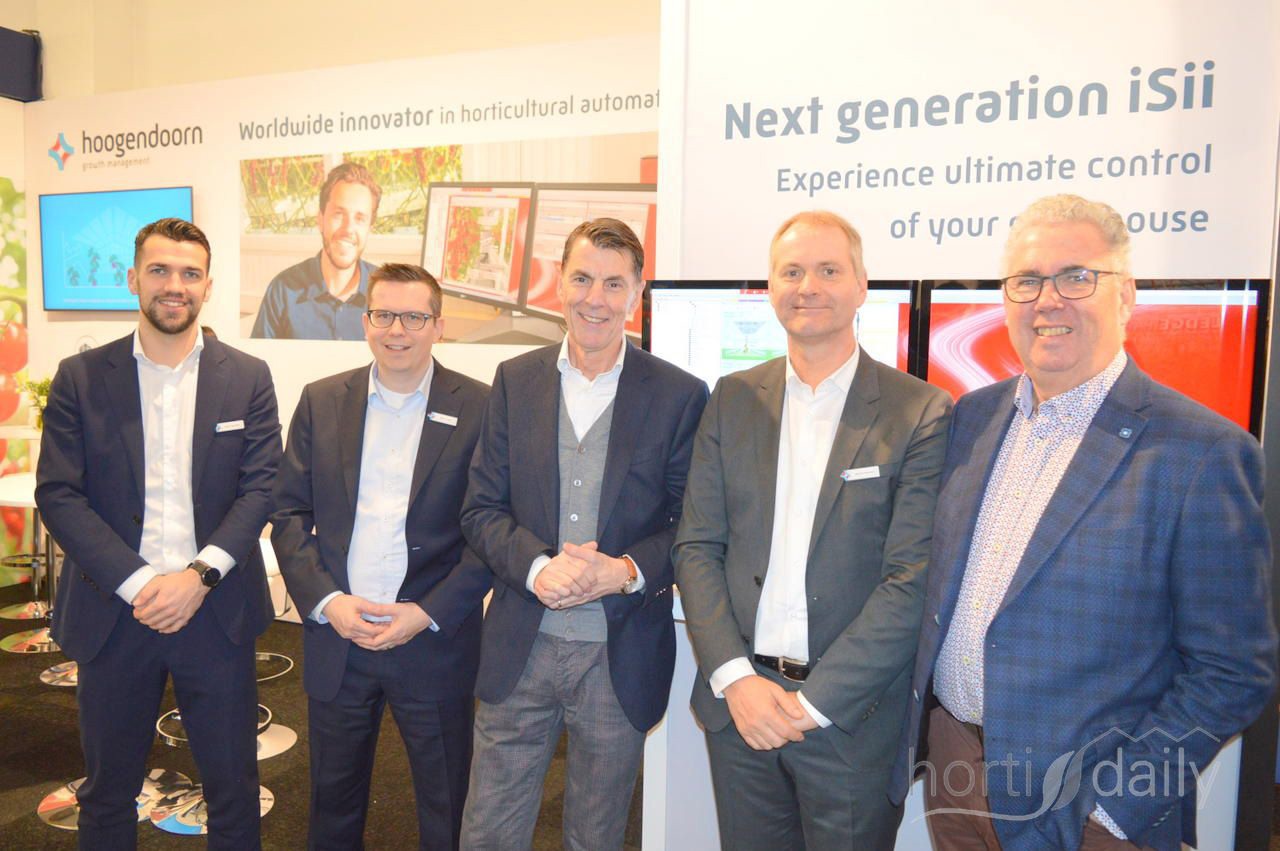 In de stand bij Hoogendoorn: Kevin Spoelder, Bart 't Hoen (Hoogendoorn), Nico Bikker (Berg Hortimotive), Martin Helmich (Hoogendoorn) en Bas Lagerwerf (Berg Hortimotive)