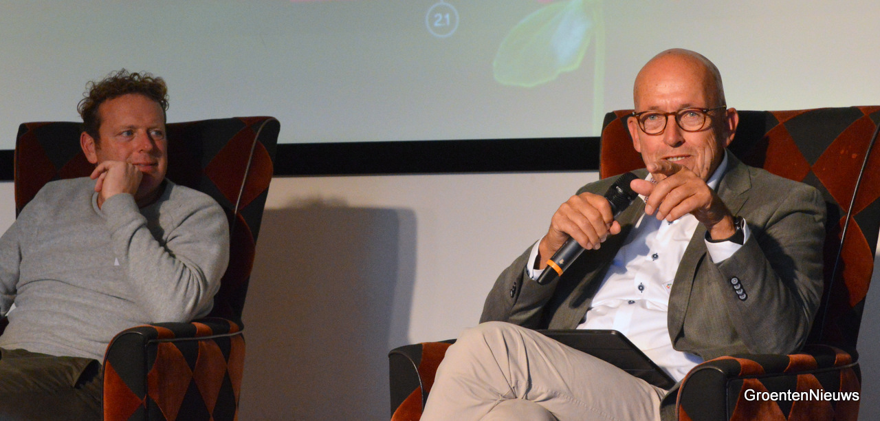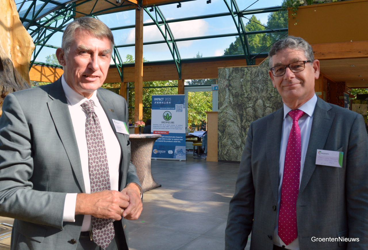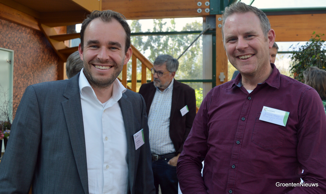 Harrij Schmeitz (juryvoorzitter van de Topsector Tuinbouw & Uitgangsmaterialen Innovatieprijs) en Alexander Formsma van Glastuinbouw Nederland. Hij fungeert dezer dagen als beleidsspecialist beleidsspecialist energie en klimaat bij de brancheorganisatie als vraagbaak voor (tuinbouw)media.