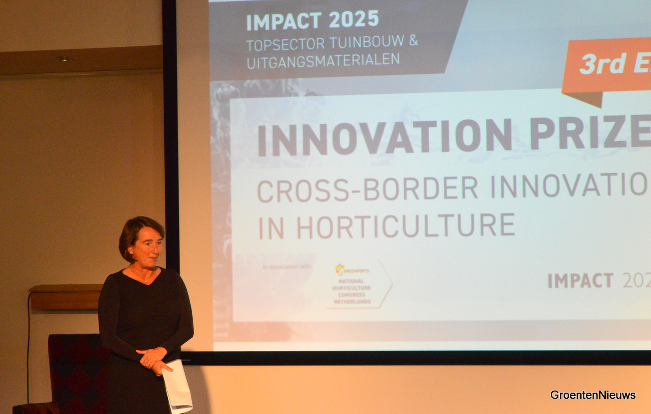 En toen was daar het moment waarop de startups zaten te wachten. Namens het ministerie van Landbouw, Natuur en Voedselkwaliteit mocht Marije Beens als directeur-generaal Agro de derde Innovatieprijs van de Topsector Tuinbouw & Uitgangsmaterialen uitreiken.