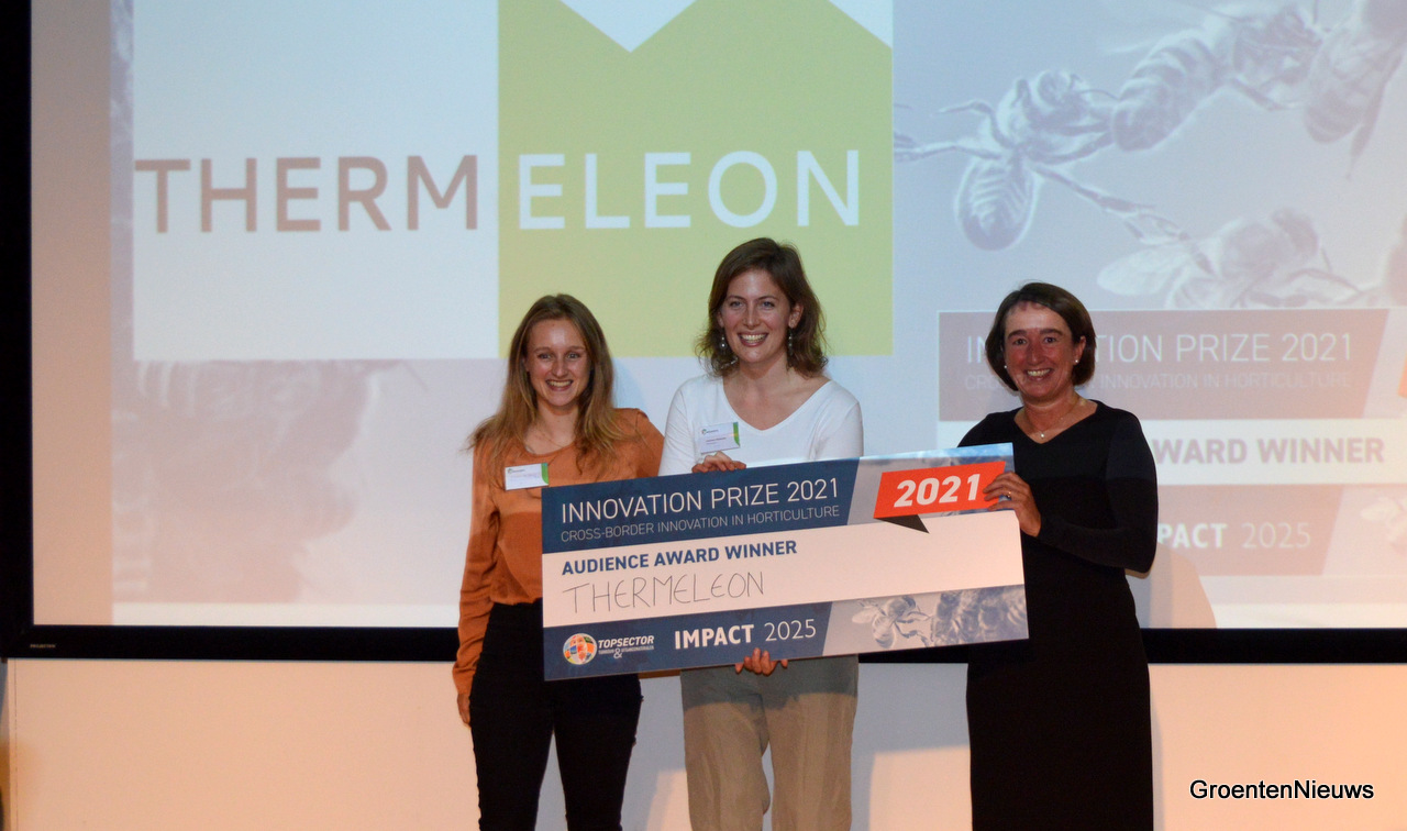En toen werden de prijzen uitgereikt. Met 596 stemmen (van de ruim 600) ging de publieksprijs naar Thermeleon. V.l.n.r. Thermeleonoprichters Jildou de Jong en Liesanne Wieleman met op rechts Marije Beens namens LNV.