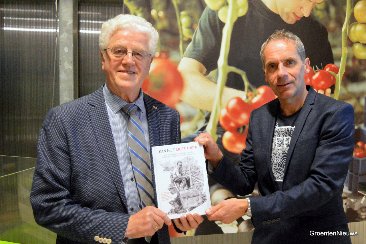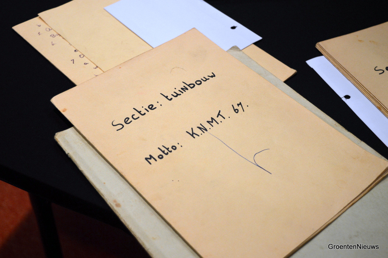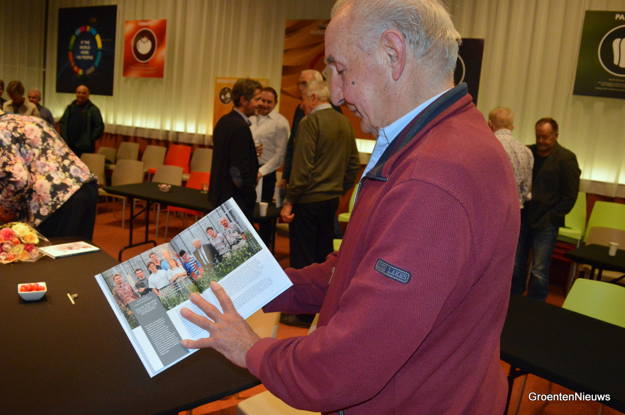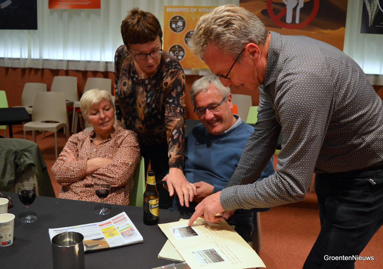 Ton Hendrix, uiterst rechts, bestudeerd het net aan hem uitgereikte boek. Hendrix was net als Jaap Zegwaard op zoek naar innovaties in de glastuinbouw, alleen dan namens het Instituut voor Mechanisatie Arbeid en Gebouwen (IMAG) in Wageningen.