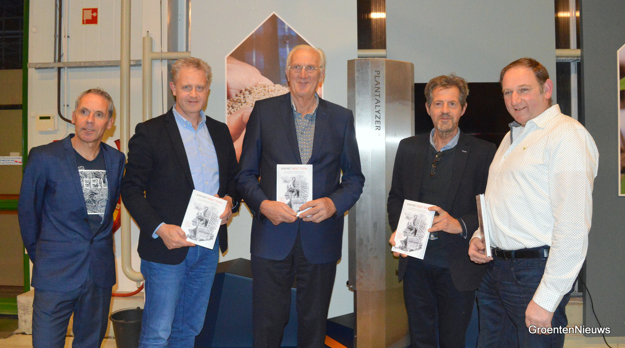 Schrijver Fred Louter met de mannen van Berg Hortimotive, v.l.n.r. Marco van der Velden, Arie van den Berg (oprichter van Berg Products, sinds 2010 Berg Hortimotive), Sjef Loomans en Leo de Jong.